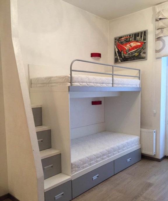 Al primo livello ci può essere un armadio, un tavolo, un divano, un'area giochi o un altro 1 letto. L'idea è di fare cassetti sui gradini. Ecco alcune foto di esempi di eleganti letti a castello:
