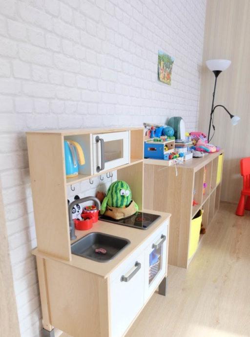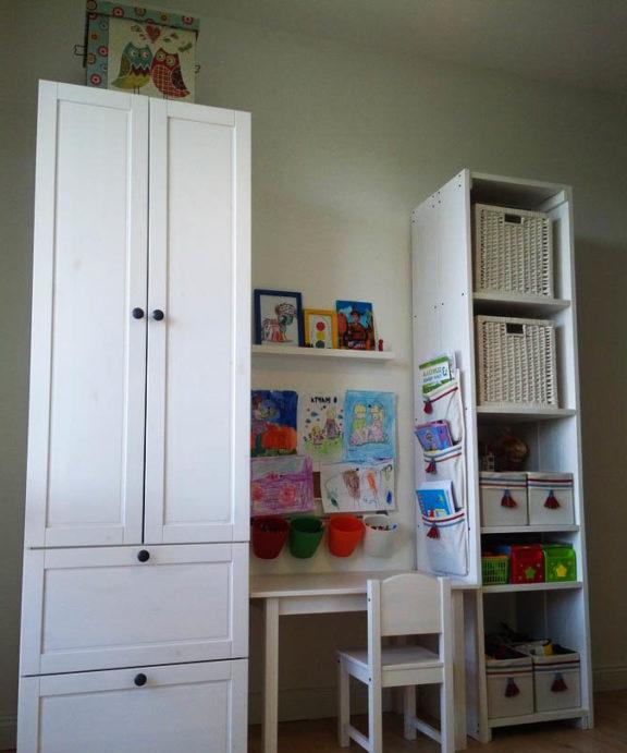 Un momento piacevole: non è assolutamente necessario acquistare deliberatamente armadi, tavoli e armadi in miniatura per bambini. Questo è uno spreco di denaro. Per i più giovani sono sufficienti sezioni a mensola aperte a pavimento e cestini per i giocattoli. Non otterrai ancora l'ordine a questa età - non ha senso creare spazi di stoccaggio chiusi.