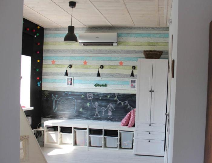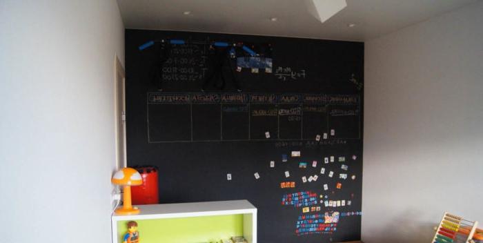 Perché in questa versione progettiamo a lungo la stanza dei bambini , è importante considerare che il bambino può provare a "migliorarlo" con matite, pennarelli o altro. È meglio fornire un posto per disegnare: una lavagna o un tabellone, un cavalletto. E l'interno salverà e darà uno sbocco creativo.