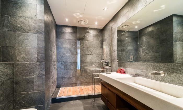 Più grandi sono le piastrelle, migliore e moderno l'aspetto del design del bagno.